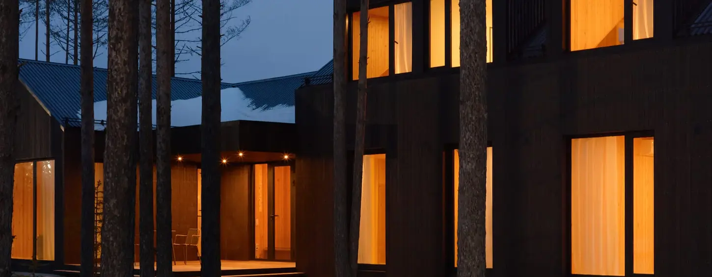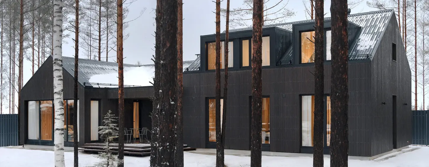 The architecture of the house evokes traditional northern rural estates: it consists of several volumes with gable roofs of varying heights, one of which features dormer windows. The exterior is finished with brown cedar cladding, characteristic of wooden architecture.